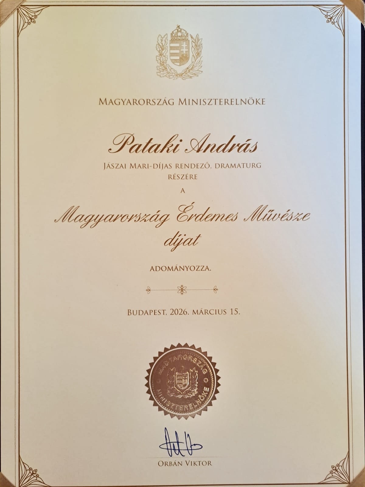 A magyar nemzeti kultúra, művészi alkotómunka területén végzett kiemelkedő művészi értékteremtő munkája elismeréseként Magyarország Érdemes Művésze díjban részesült PATAKI ANDRÁS Jászai Mari-díjas rendező, dramaturg, kulturális menedzser. Pataki András alapította 1986-ban az ajkai Forrás Színpadot, amely később Forrás Színház néven működött tovább. 1991-1996 között a Veszprémi Petőfi Színház színésze volt. Később az Evangélium Színház vezetője volt, dolgozott a győri Újvárosi Művelődési Ház vezetőjeként, valamint a Veszprémi Petőfi Színház tanácsadójaként is. 2012-től a Soproni Petőfi Színház igazgatója. 2008-tól a Magyar Versmondók Egyesületének alelnöke, 2021-től a Színház- és Filmművészeti Egyetem tanára. 2021-től rövid ideig a kecskeméti Katona József Színház művészeti tanácsadója, majd az Újszínház művészeti vezetője volt. A Magyar Versmondók Egyesületében, mint szakmai alelnök, hatékony segítséget nyújtott a Kaleidoszkóp VersFesztivál, azon belül a Holokauszt Emlékév és a Ratkó József Emlékév programjainak megszervezésében Sopronban. Társalapítója a Regösök húrján… Kárpát-medencei általános iskolai versmondó versenynek, rendszeres oktatója a Színházi és Versművészeti Táboroknak, szervezője az irodalmi évfordulós költők, írók emlékestjeinek.