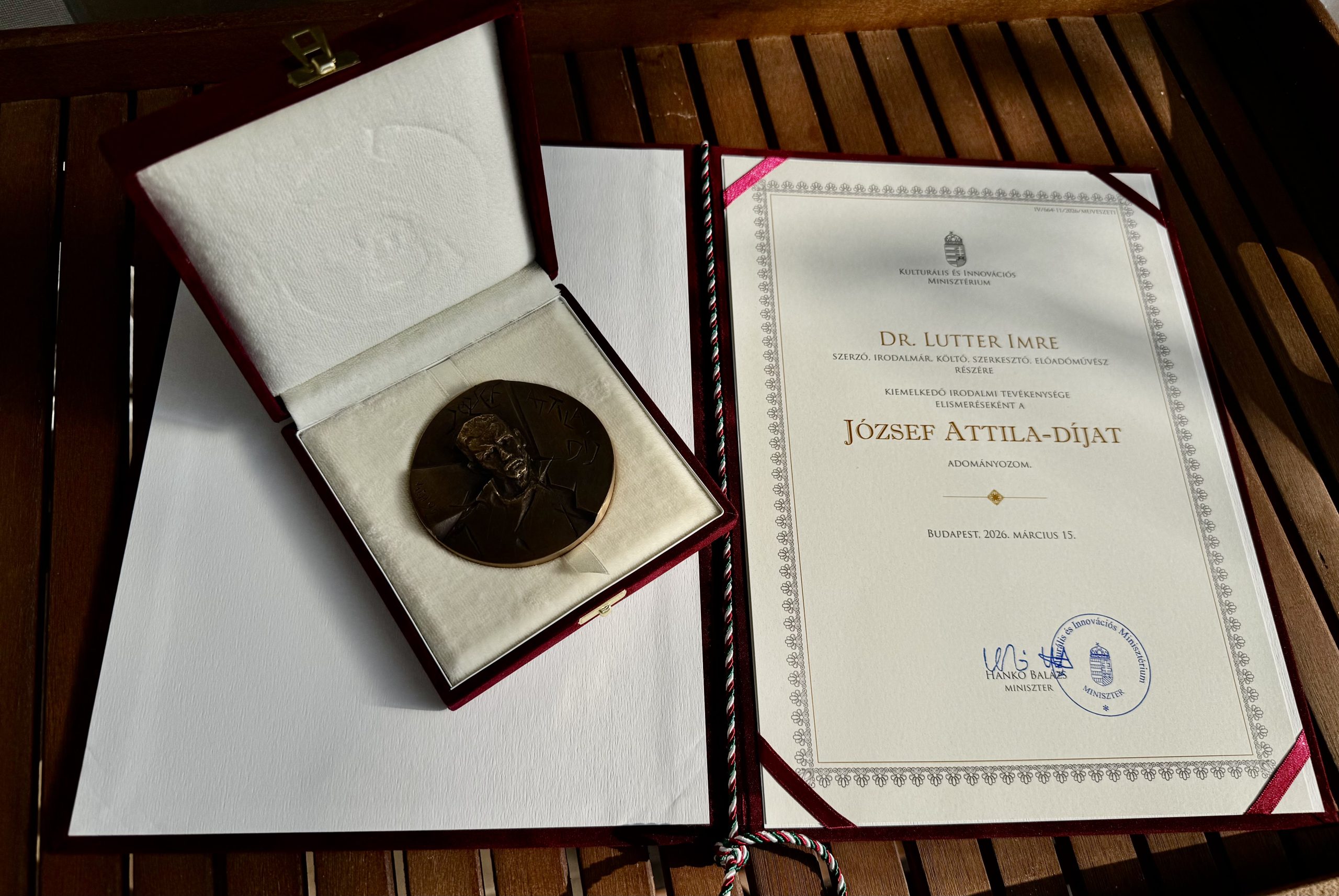 Kiemelkedő irodalmi – költői, írói, irodalomtörténészi – tevékenysége elismeréseként József Attila-díjban részesült LUTTER IMRE Bánffy Miklós-díjas költő, szerkesztő, előadóművész, a Magyar Versmondók Egyesületének elnöke.